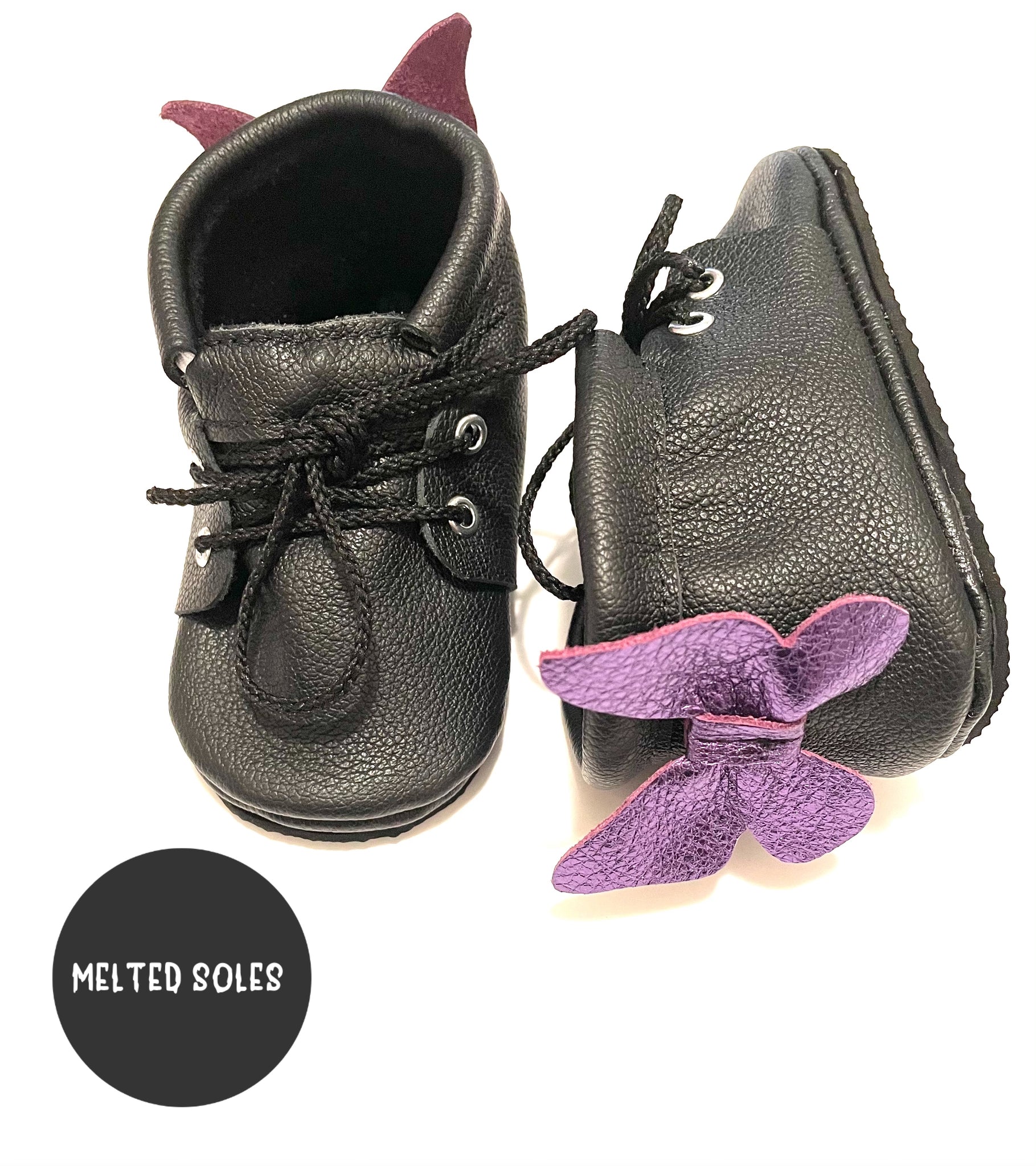 These are made with 100% black leather and metallic purple leather. Laces will be black. Size 4 and up will come with soft ToughTek soles that are water, slip and heat resistant.