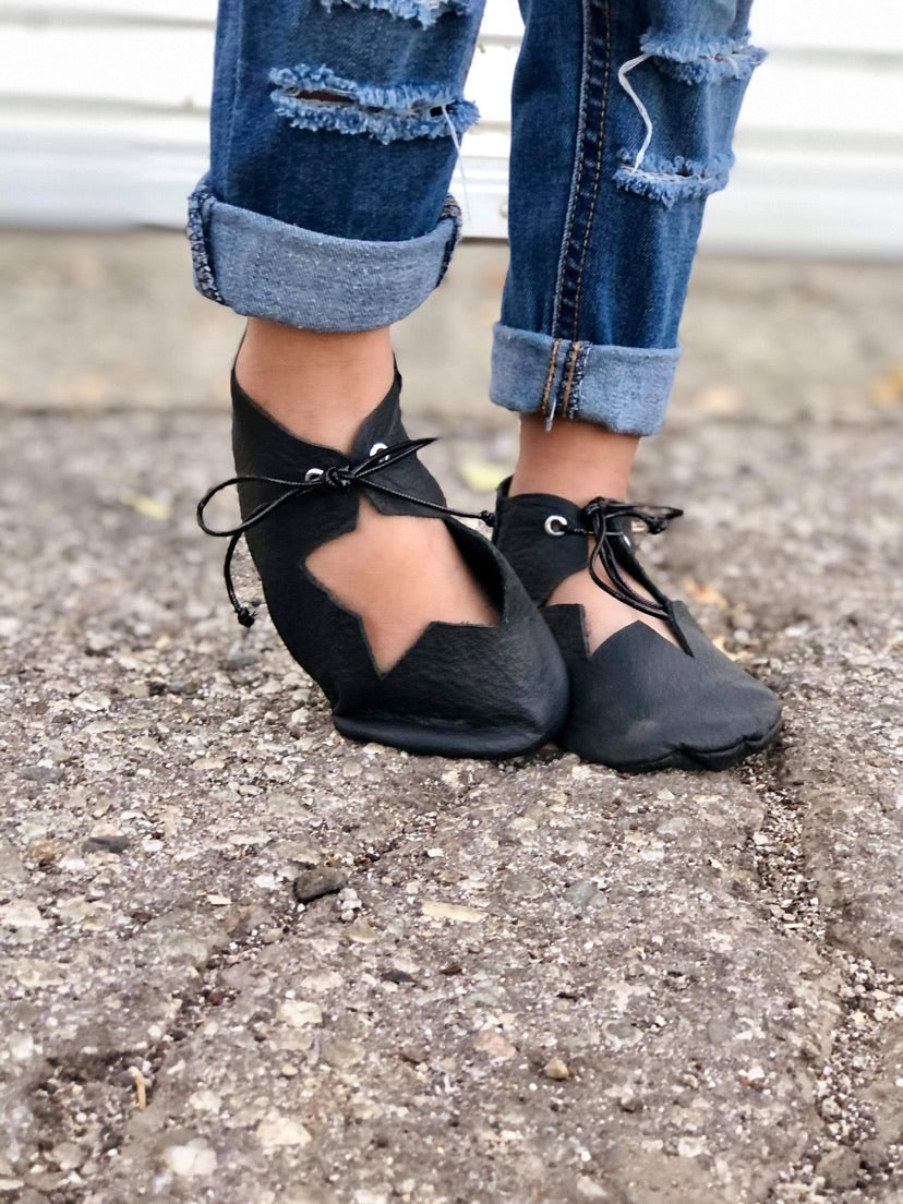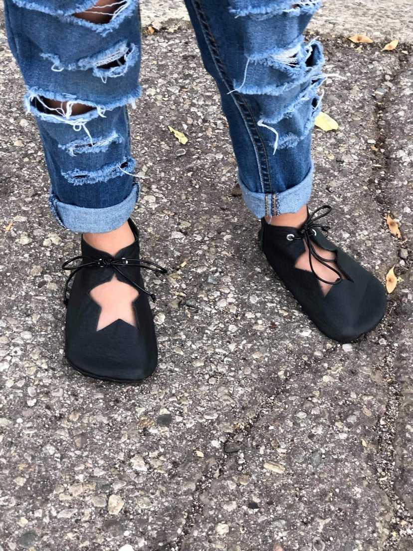 These StarFall shoes are a laced Maryjane style with a star cutout on the instep. The laces are leather with metal eyelets and when you order a size 4 and up they will come with Toughtek soft rubber soles that are water and heat resistant.