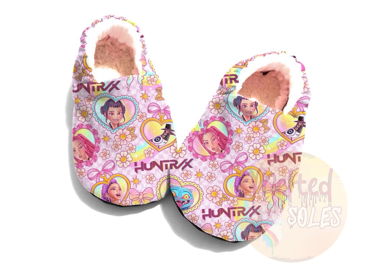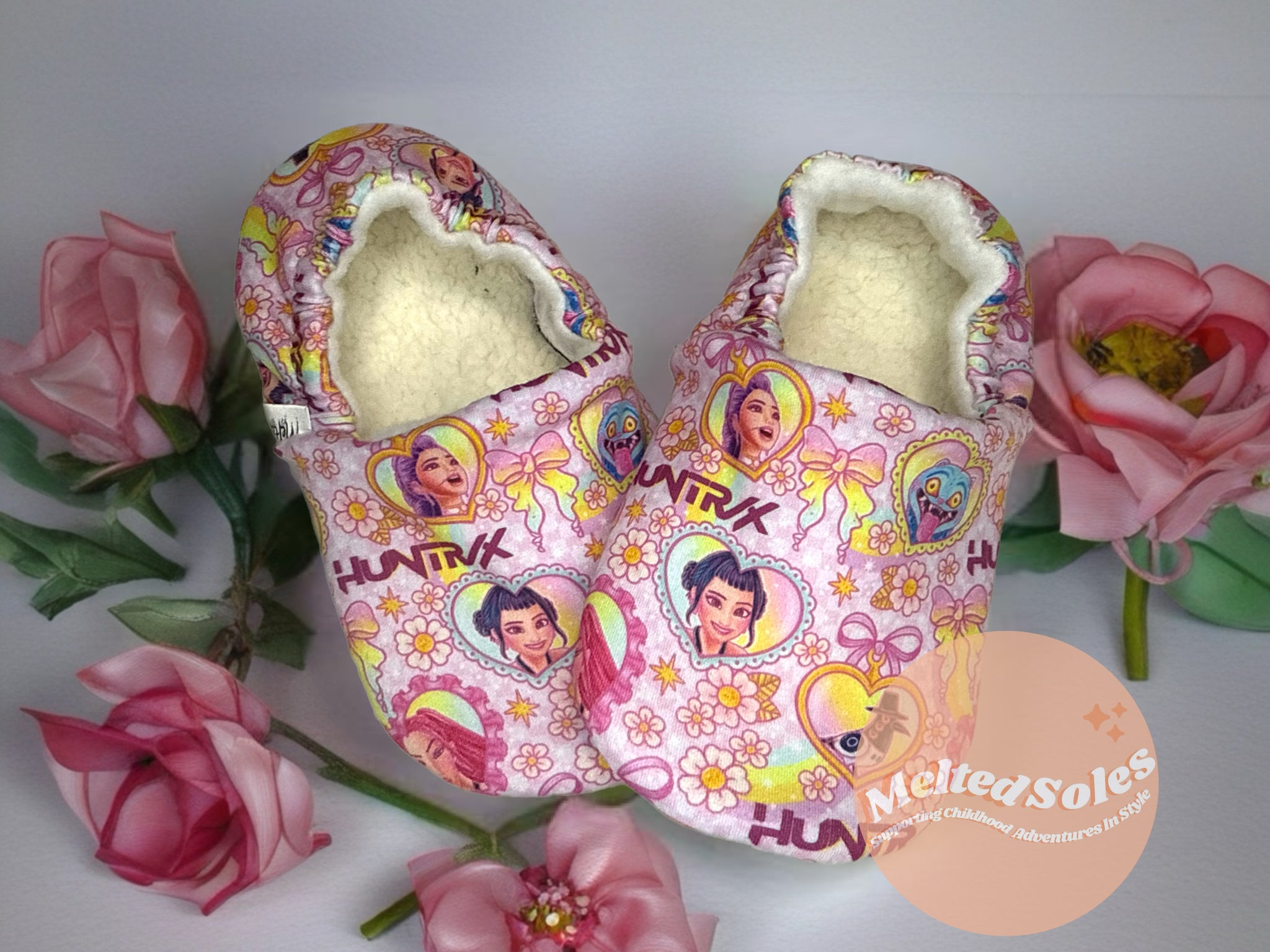 These booties are a printed on all natural fabric base with anti pill lining. Sizes 5” and up will come with ToughTek soles that are water, heat and slip resistant.